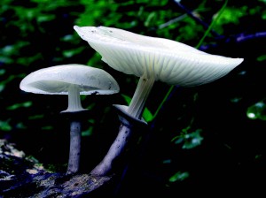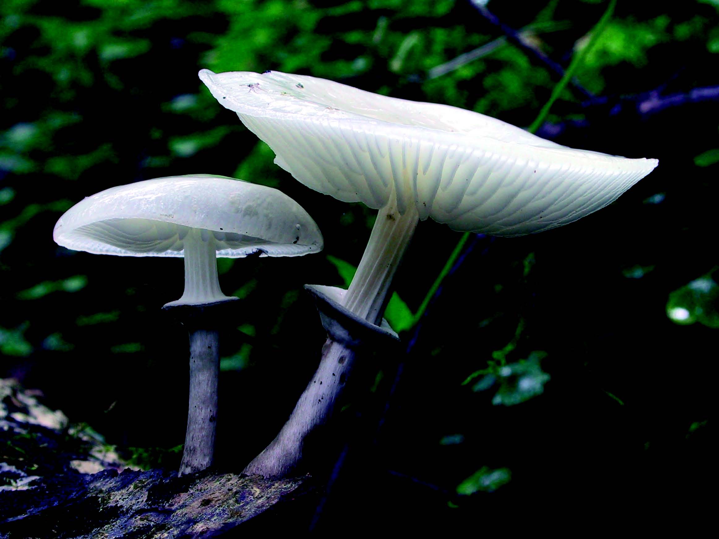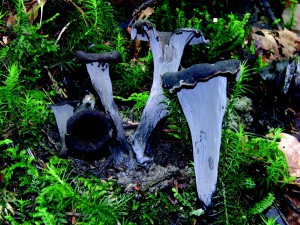 Die Herbsttrompete (Foto rechts) findet sich oft in großen Scharen in Laubwäldern unter Rotbuchen, seltener auch unter Edelkastanien. Sie ist ein begehrter Speisepilz.