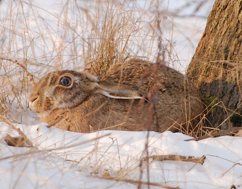 Der Feldhase ist der kleinste unserer Säugetiere, der selbst im harten Winter ohne Nest oder Höhle auskommt. Er scharrt sich im Unterholz eine Mulde und formt diese zur sogenannten «Sasse». Hier verbringt der Feldhase gut getarnt sowie bewegungslos mit wachem Blick den Tag, weshalb man früher glaubte, der Hase schlafe mit offenen Augen. Feldhasen ernähren sich wie alle Hasen ausschließlich pflanzlich. Sie fressen grüne Pflanzenteile, aber auch Knollen, Wurzeln und Getreide sowie vor allem im Winter die Rinde junger Bäume.